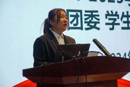 文艺部负责人马雨竺作为代表发言。她回顾了自己过去一年的工作经历,分享了在各类活动中不断成长的故事。她的发言充满了对过去的感悟与对未来的展望,并向新一届学生会成员表达了诚挚的祝福与美好期许。