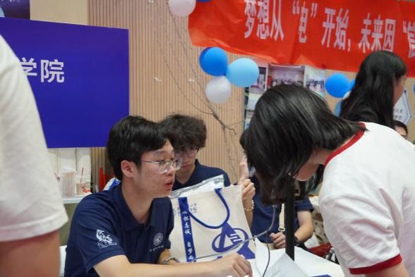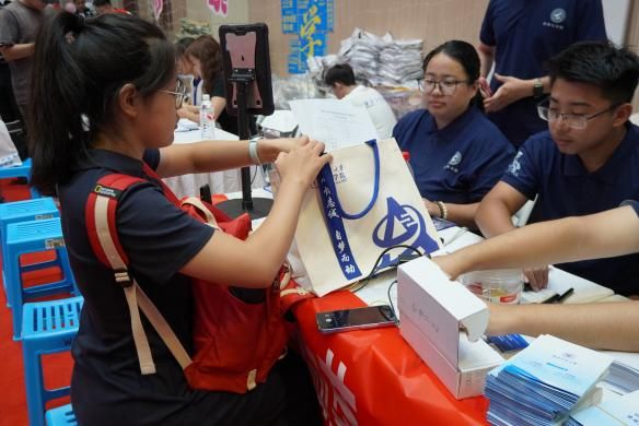 体育馆外的迎新摊位上,学院为新生准备了鼠标垫、帆布袋、钥匙扣、文创校园地图和新生手册等礼品,祝福同学们顺利进入大学生活。