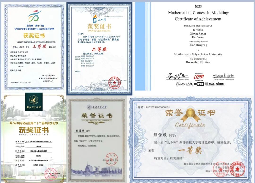 在学业上,熊佳欣也从未懈怠。自入学以来,她认真完成课业任务,注重方法创新,在打牢自身专业知识的基础上,还注重综合素质的发展,综测绩点均名列前茅。她在2024年度及2025年度的校物理实验竞赛(创新)中分别获得校一等奖和校特等奖。在2024“外研社·国才杯”“理解当代中国”全国大学生外语能力大赛短视频赛道中获得省级铜奖,在2025年美国大学生数学建模竞赛中获得H奖,在第十八届全国大学生节能减排社会实践与科技竞赛中获得全国三等奖,在第十五届全国大学生电子商务“创新、创业及创意”挑战赛中获得全国二等奖。