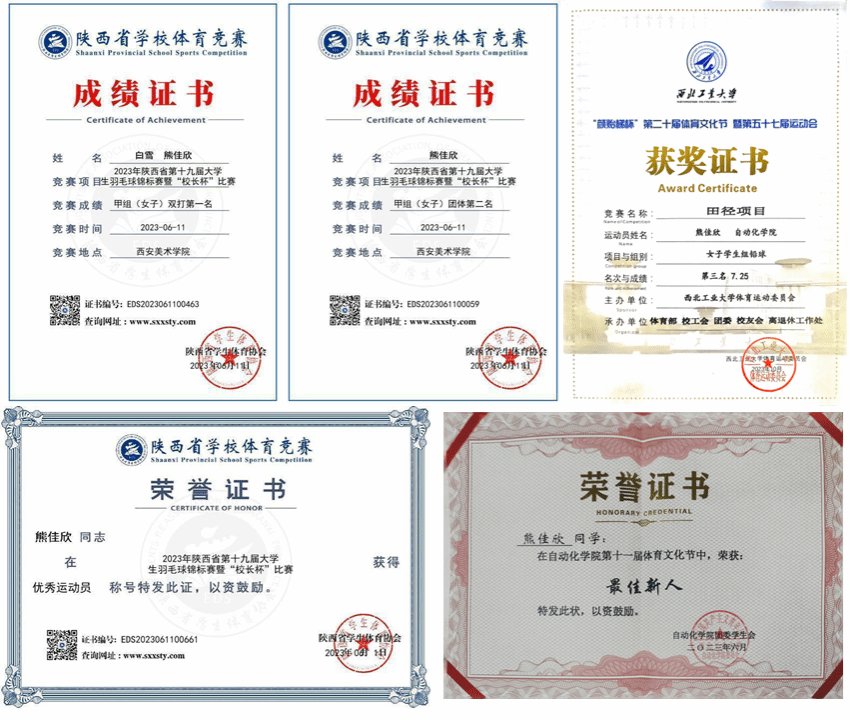 台上一分钟,台下十年功,赛场上从容不迫的背后,是熊佳欣成千上万个日夜的重复练习。正因如此,她在省级、校级、院级等各项体育赛事中均取得优异成绩。熊佳欣在 陕西省 第十九届 大 学生羽毛球锦标赛中,荣获“优秀运动员”称号;代表学院参加校级2022-2025年度羽毛球三航杯、校运会,均取得优异成绩;在2024年度和2025年度校运会跳绳比赛获得团体亚军、季军;获评校级2023年度“体育先进个人”荣誉称号;在院级体育活动中,参与获得羽毛球团体季军、拔河比赛冠军,并在足球与篮球比赛、田径比赛中取得优异成绩,入选学院田径队;荣获学院第十一届体育文化节“最佳新人”称号。