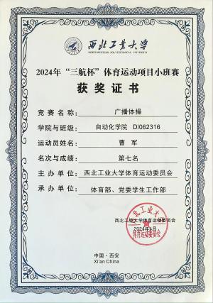 作为自动化院足球队的主力队员,他凭借出色的球技和顽强的精神,跟随院队征战各级赛事,获得“三航杯”季军等5项奖项。除了足球,其他体育项目也有他矫健的身影。“三航杯”广播体操比赛获第七名,校运动会“团体单摇”项目获团体第三名,用实力赢得“体育先进个人”荣誉称号,展现出“文武兼备”的青春风采。