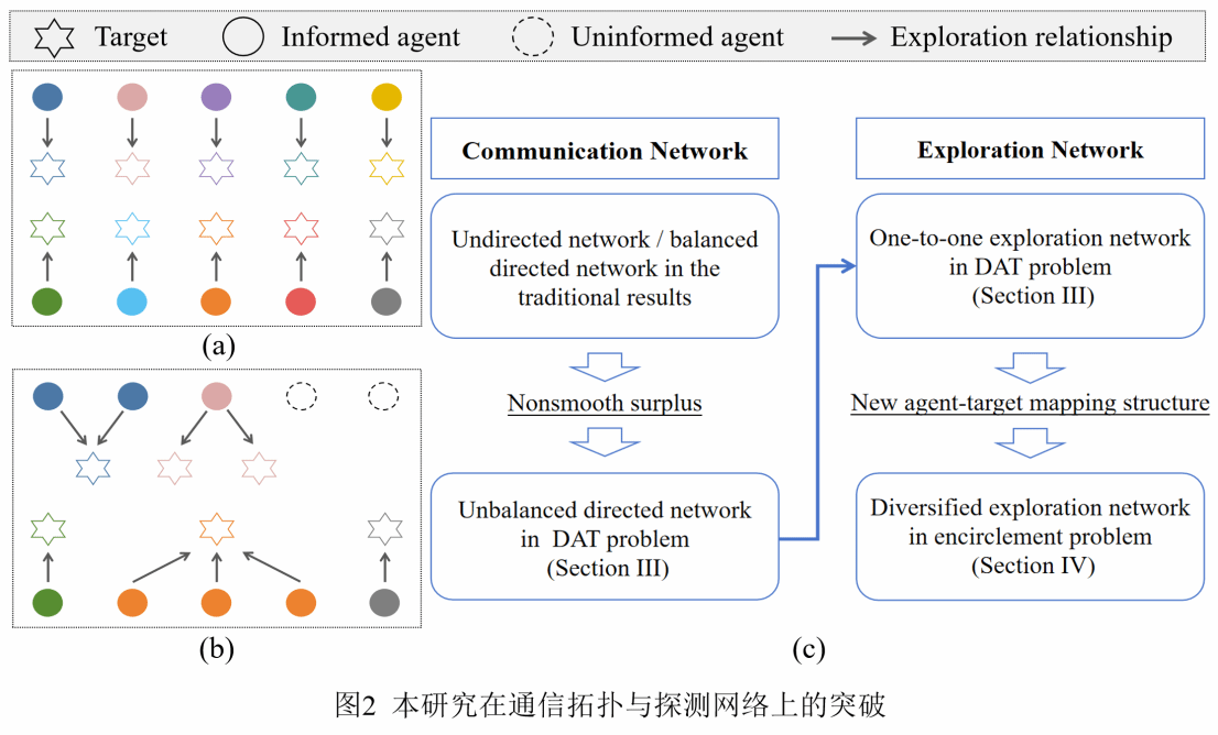 为应对动态非合作目标集群协同围捕问题中,多目标动态轨迹中心跟踪难的挑战,团队针对非对称网络上分布式平均跟踪理论问题开展研究,创新地提出了“非光滑盈余”概念,将其成功引入分布式平均跟踪控制器设计中,攻克了非对称网络拓扑的不平衡条件,实现了对多目标动态轨迹中心的精确跟踪。相关结果以长文形式发表于控制领域权威期刊《IEEE Transactions on Automatic Control》(IEEE TAC),题为《有向通信网络上的分布式平均跟踪:一种非光滑盈余方法》(Distributed Average Tracking over Directed Communication Networks: A Nonsmooth Surplus Approach)。该论文由suncitygroup太阳集团博士研究生曹润华与suncitygroup太阳集团赵宇教授共同完成,索引信息参见DOI: 10.1109/TAC.2025.3629024(全文https://ieeexplore.ieee.org/document/11226888)。