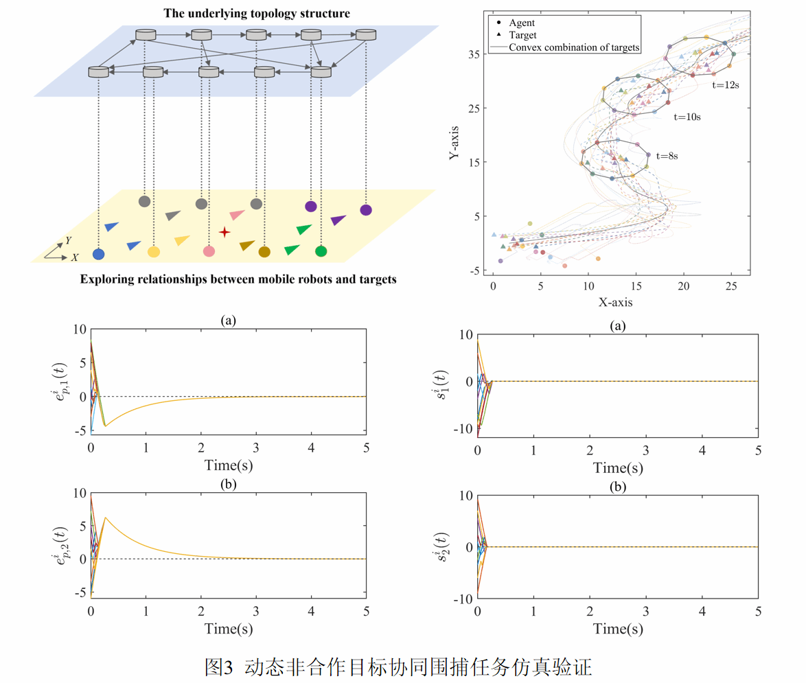 为验证算法的实际性能,研究团队将非光滑盈余分布式平均跟踪方法拓展于多样化探测网络中的非合作动态目标协同围捕任务。所提出的多样化探测网络突破了传统分布式平均跟踪方法对拓扑结构与智能体-目标探测关系“一对一”的严格限制(图2),实现了支持“一对一”、“一对多”、“多对一”等多样化探测情形的分布式平均跟踪。基于该场景开展的数值仿真表明(图3),算法运行稳定可靠,成功验证了其在非合作动态目标协同围捕方面的优越性能。该成果有望推动集群多样化协同探测、空间安全与人工智能等多个领域向更高效、更智能的方向发展。