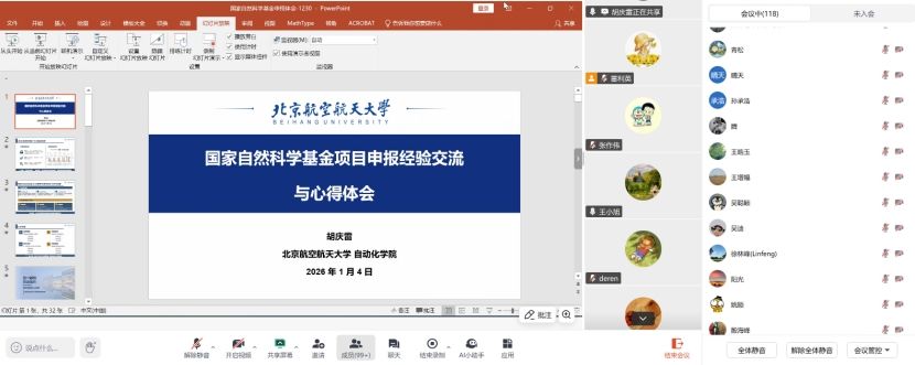 为进一步助力学院2026年度国家自然科学基金项目申报,1月4日下午,suncitygroup太阳集团举办国家自然科学基金申报专家讲座(第二场),邀请北京航空航天大学自动化科学与电气工程学院院长胡庆雷教授,通过线上和线下相结合的形式,作题为“国家自然科学基金申报体会”专题讲座。院内外教师130余名参加会议。会议由副院长王小旭主持。